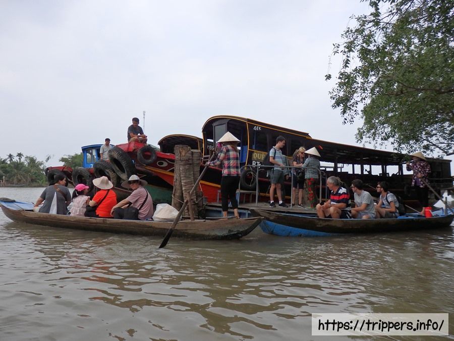 車でホーチミンからミトーにあるメコン川へ移動し、船に乗り換え最初の島へ移動します。メコン川の主流は大きな川であり、川幅があります。参加者は韓国人が半分以上占めており、家族連れが多かったです。