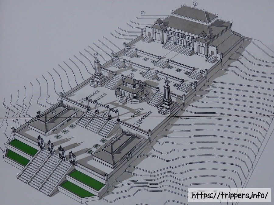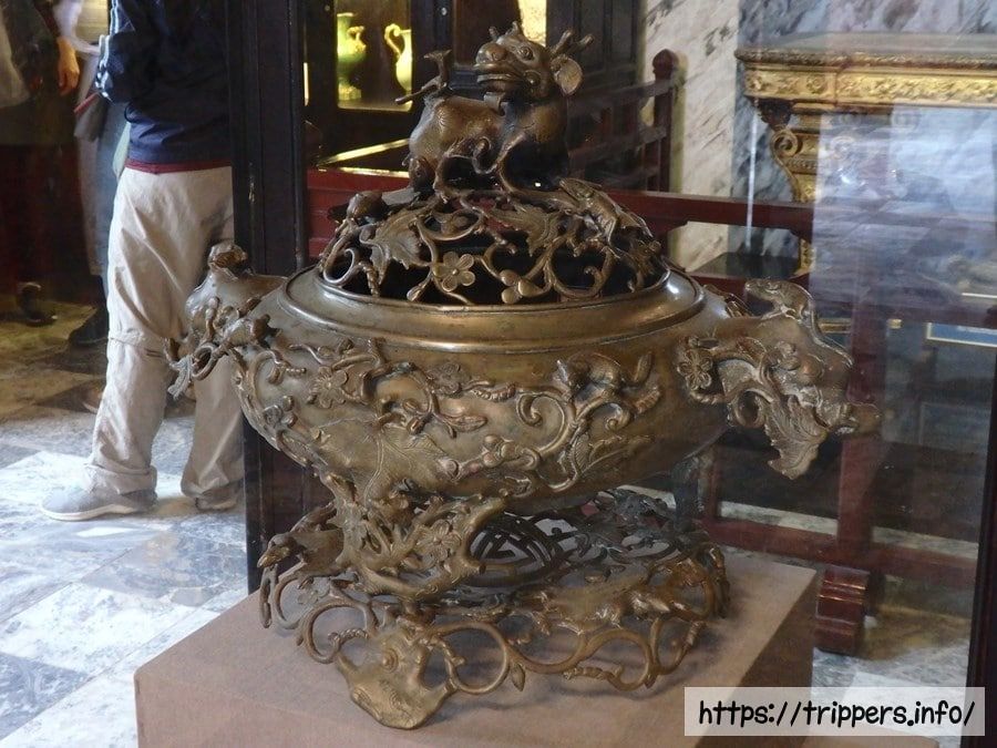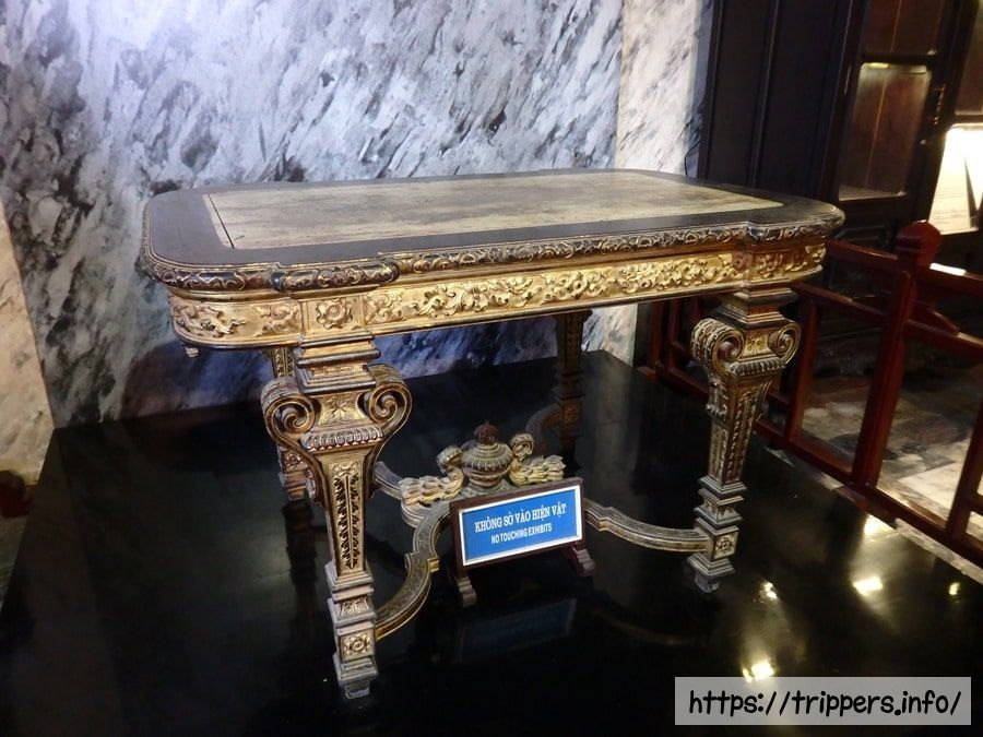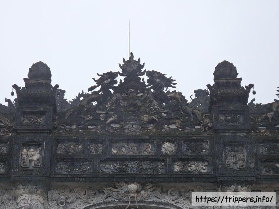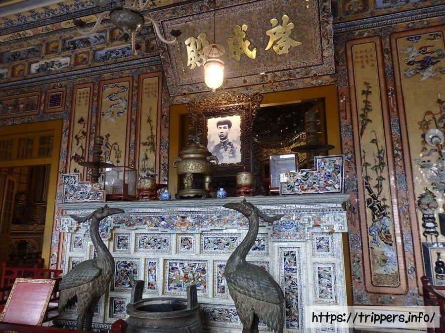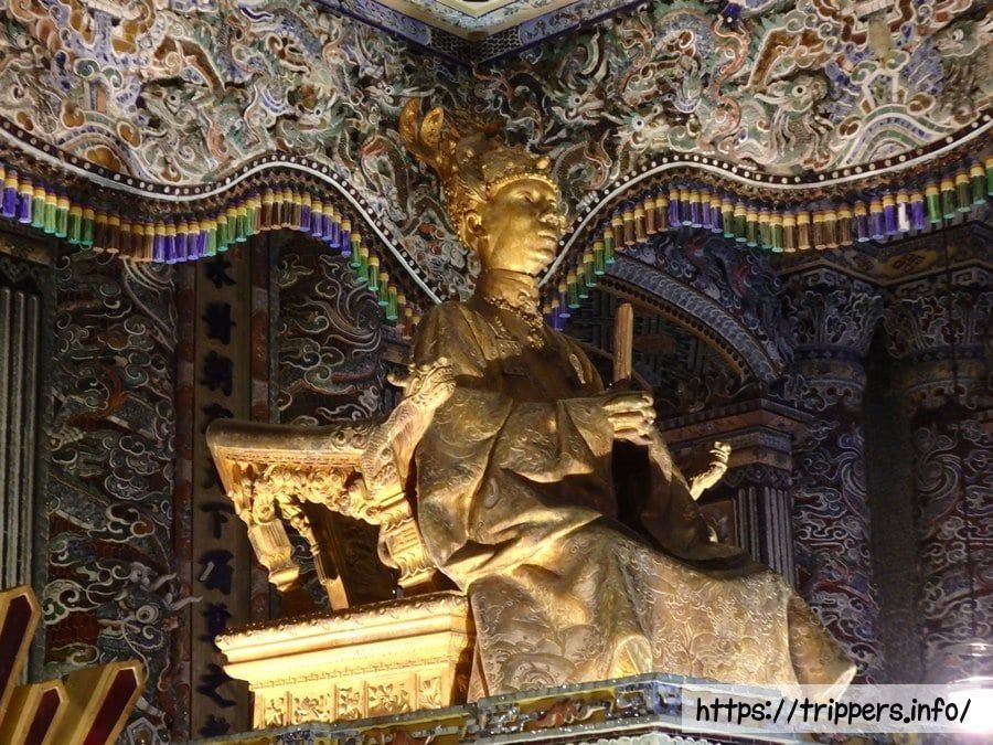 金箔を施した青銅のカイディン等身大像の下に遺体が安置されています。先代の第11代皇帝ズイタン帝は宗主国フランスを排除しようとしたために廃位され、レユニオン島へ流刑となりました。先代の代わりに、フランスによって擁立され第12代皇帝となったカイディン帝は「フランスの保護下で贅沢な暮らしをしているあやつり皇帝」と見られています。第13代皇帝バオダイ帝はカイディン帝の息子であり、ベトナム最後の王朝であるグエン朝(1802~1945)において最後の皇帝です。