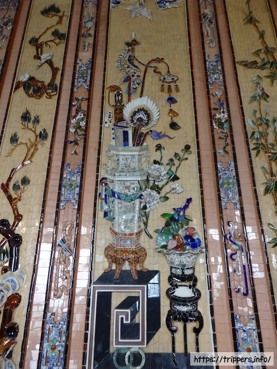 モザイク装飾には中国の陶器や日本のビール瓶が使われています。