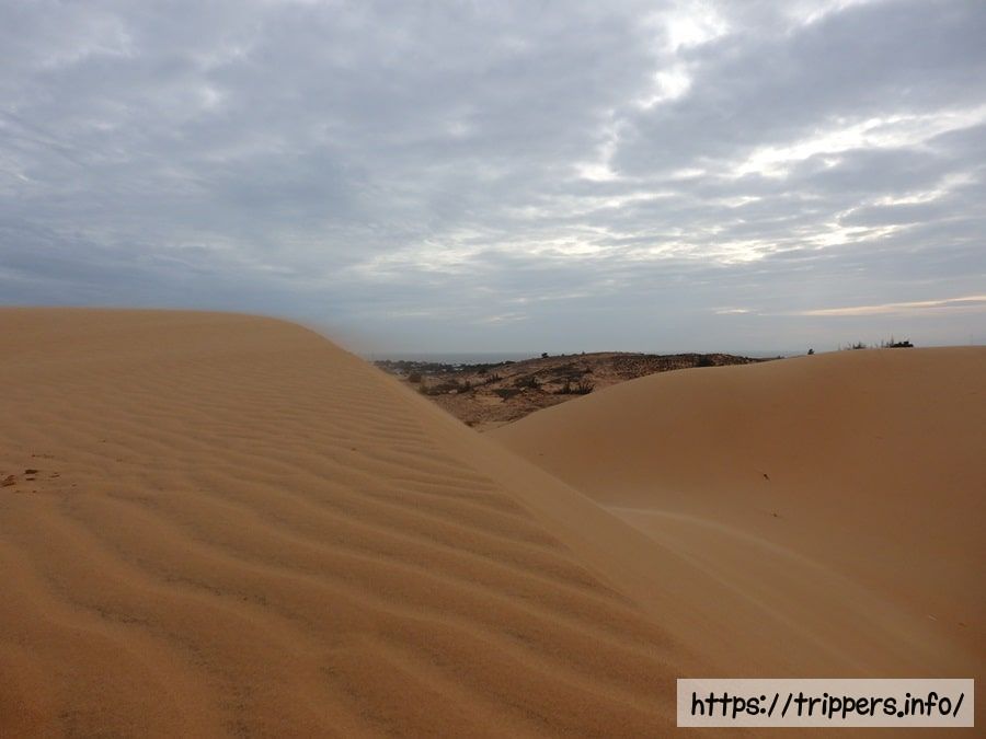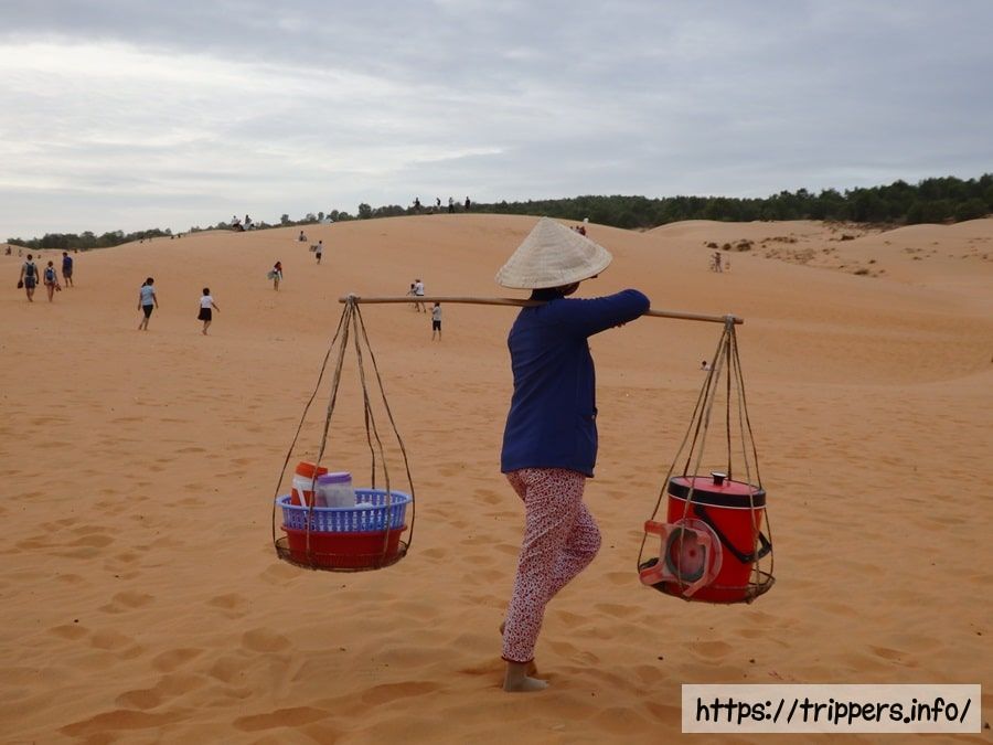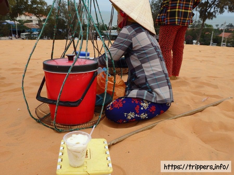 ムイネーには赤色と白色の砂丘があり、ムイネー砂丘と呼ばれています。その砂丘の1つが赤い砂丘です。赤い砂丘はムイネーの中心地から近い場所にあり、砂丘の中で売り子が豆腐プリンを販売しています。甘さ控えめで美味しいです。有料でソリの貸し出しがあり、砂滑りができます。早朝に訪れると人の足跡は風によって消され、風による綺麗な模様が砂に描かれて味わいがあります。