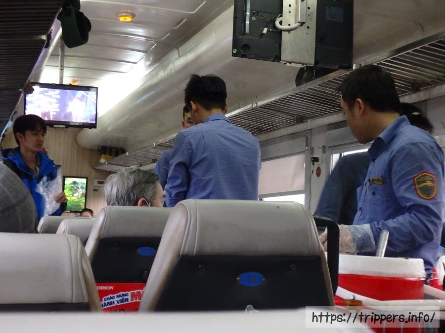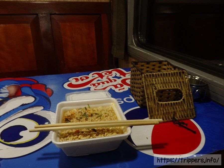 列車内では移動販売と食堂車があります。移動販売ではプレートにおかずやご飯がよそられた物から、お粥やトウモロコシなどあります。食堂車でも食事が出来ますが、職員が食事の時(夜は午後7時ごろ)は食事できません。提供可能な食事は時間帯に左右されます。食堂車で職員が食事する直前に食事を頼むと、カップ麺しか出てきませんでした。しかも食堂車は他の車両よりもすごく揺れます。