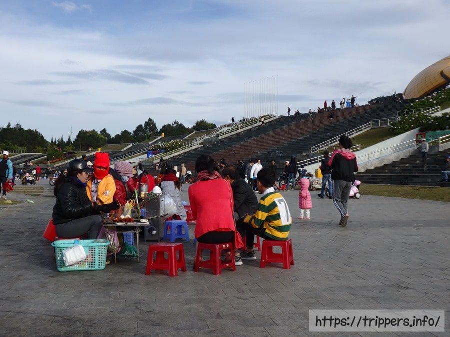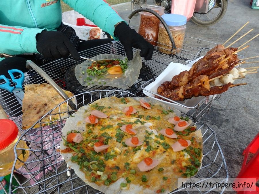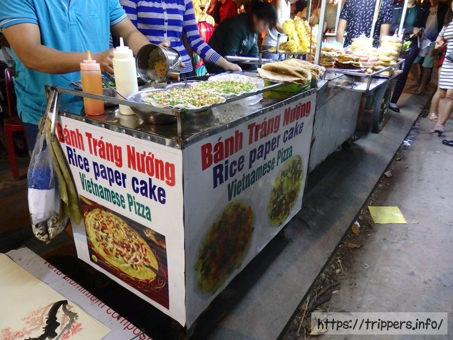 ダラットでは至る所でベトナム風ピザの露店を見かけます。特にダラット市場周辺で毎晩開かれる夜市では幾つもの露店が連ねています。他に、ハノイのホアンキエム湖やダナンのバク・マイ・アン・マーケットの外、ホイアンのホイアン市場の前でも販売しています。観光地値段ではない場合、1枚10,000VNDで販売しています。観光地値段の場合は、そこのお店は衛生的に食べて大丈夫か注意が必要です。(一番下に記載してある注意に身の毛がよだつ話を書いてあります。)