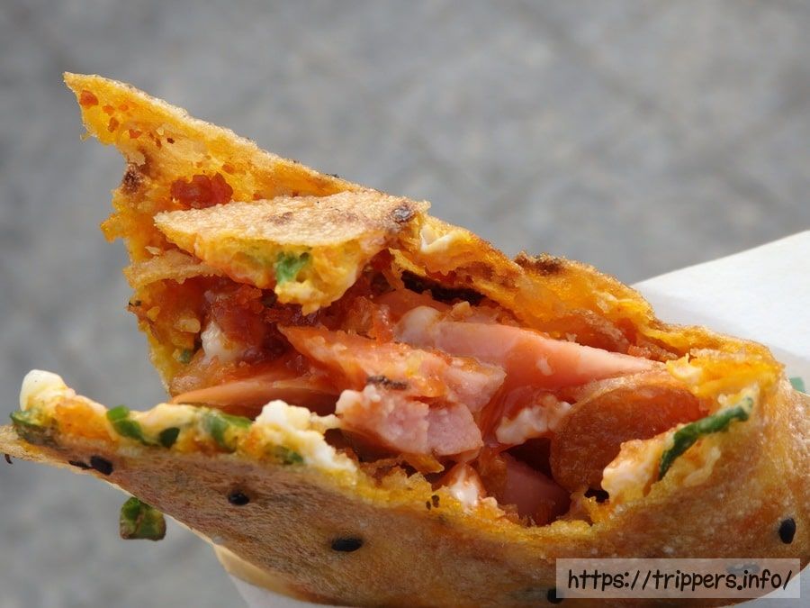 ピリ辛ソースとマヨネーズ、ソーセージで味が決まり、パリパリした生地とフワフワした具材の食感が美味です。