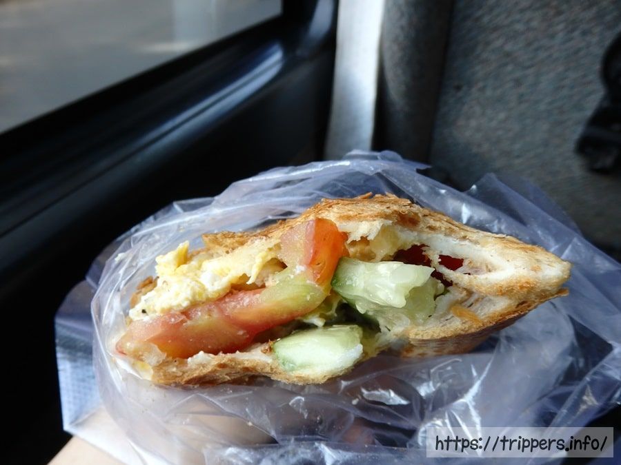 卵焼きが入ると、フランスパン特有の、口の中の水分がパンに吸収されるパサパサ感が気にならなくなります。水を飲まなくても、丸ごと食べられてしまいます。