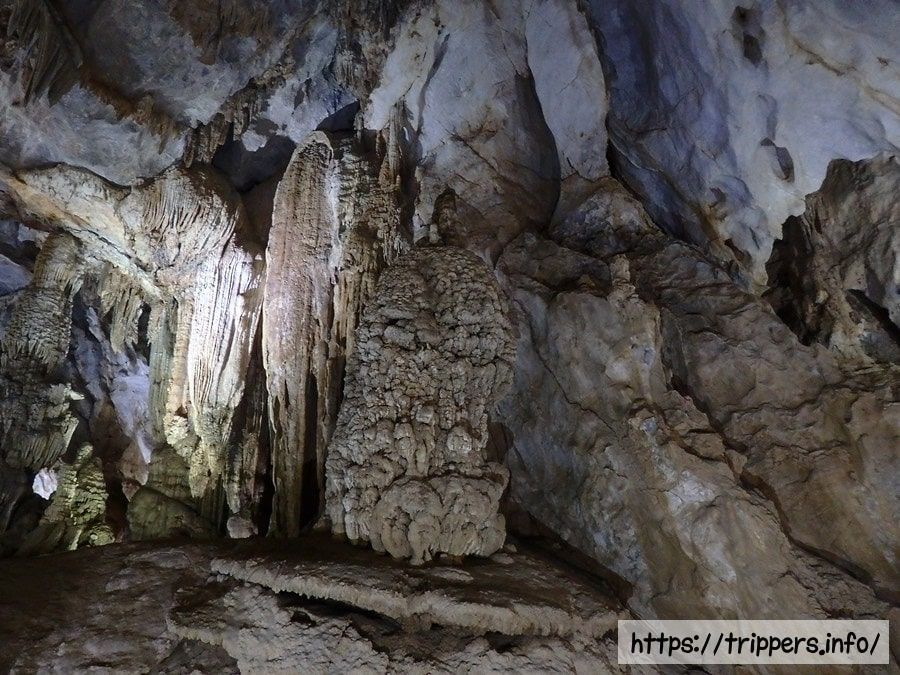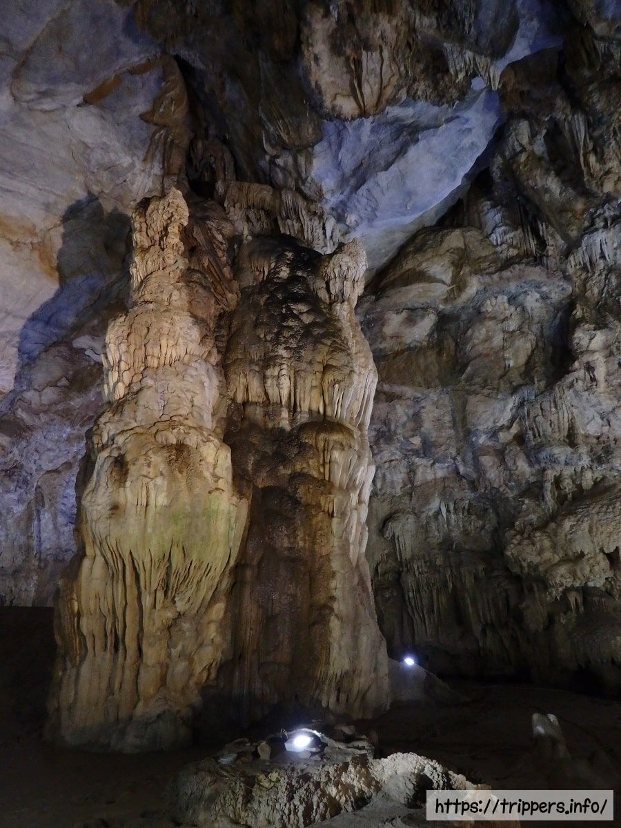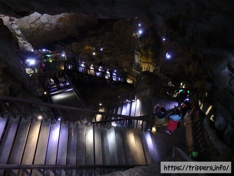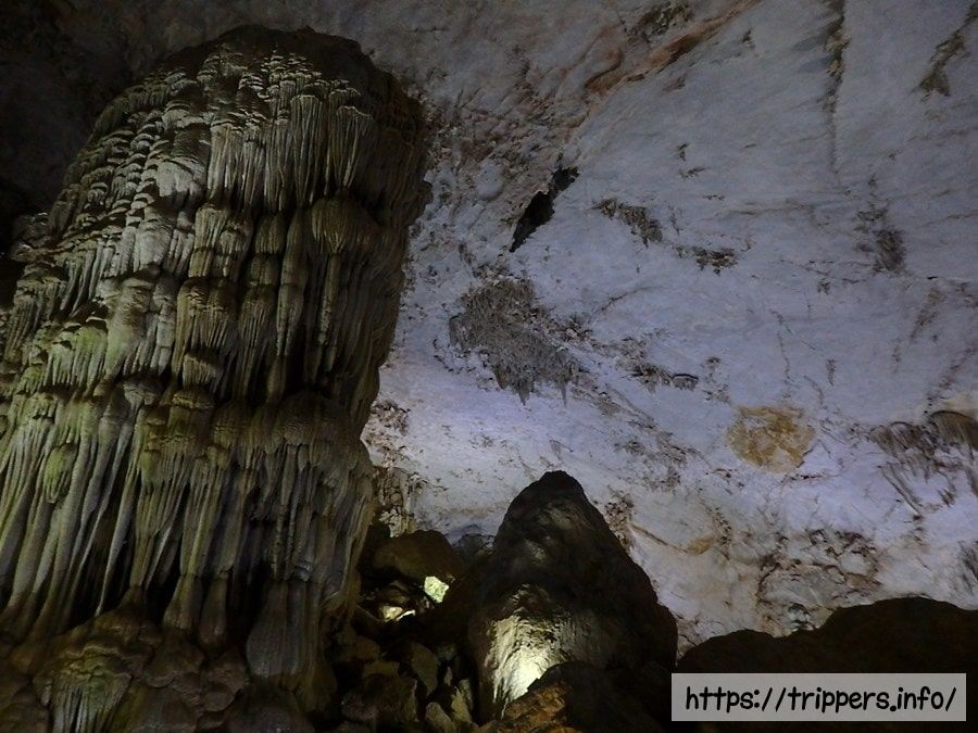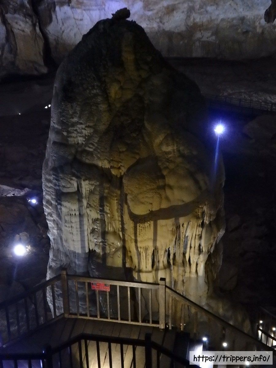 洞窟に入るとまずは階段を降りて行きます。まず最初に目につくのは巨大な石筍です。